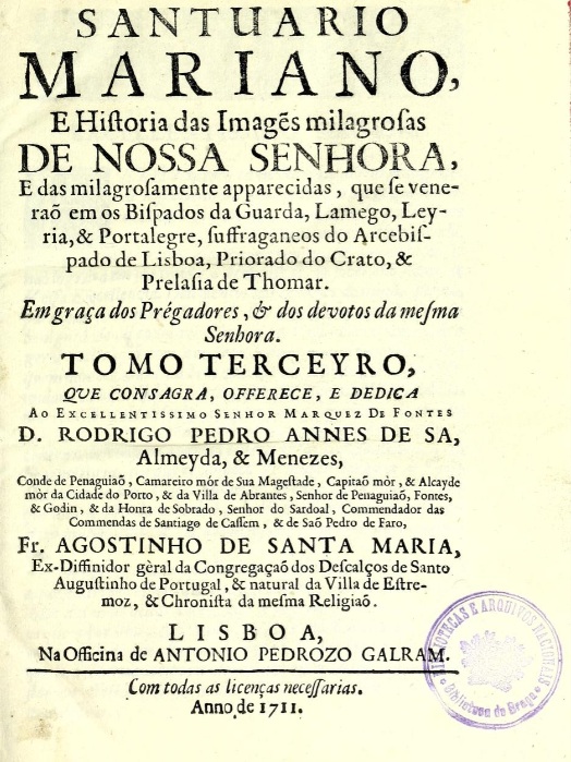 Frei Agostinho de SANTA MARIA. Santuario Mariano, e historia das imagens milagrosas de Nossa Senhora, e das milagrosamente apparecidas em graça dos pregadores e dos devotos da mesma Senhora. Tomo III. Lisboa: Officina de Antonio Pedrozo Galrão, 1711.