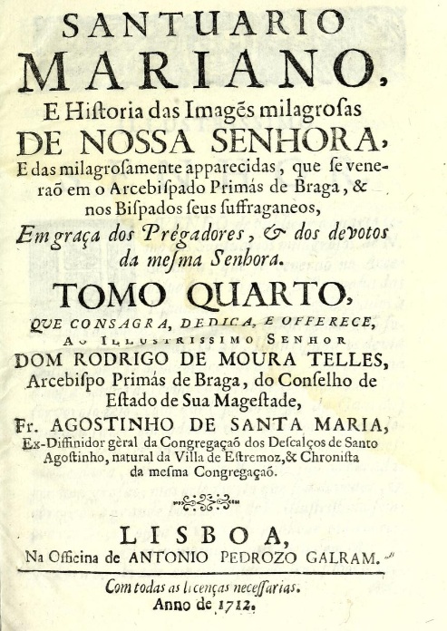 Frei Agostinho de SANTA MARIA. Santuario Mariano, e historia das imagens milagrosas de Nossa Senhora, e das milagrosamente apparecidas em graça dos pregadores e dos devotos da mesma Senhora. Tomo IV. Lisboa: Officina de Antonio Pedrozo Galrão, 1712.