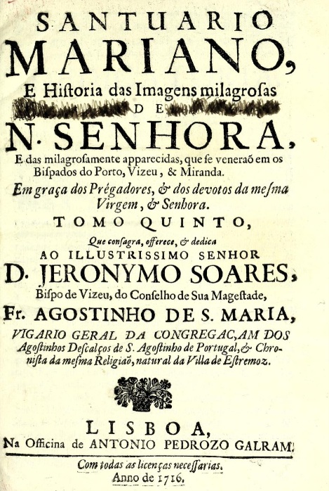 Frei Agostinho de SANTA MARIA. Santuario Mariano, e historia das imagens milagrosas de Nossa Senhora, e das milagrosamente apparecidas em graça dos pregadores e dos devotos da mesma Senhora. Tomo V. Lisboa: Officina de Antonio Pedrozo Galrão, 1716.