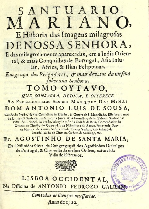 Frei Agostinho de SANTA MARIA. Santuario Mariano, e historia das imagens milagrosas de Nossa Senhora, e das milagrosamente apparecidas em graça dos pregadores e dos devotos da mesma Senhora. Tomo VIII. Lisboa: Officina de Antonio Pedrozo Galrão, 1720.
