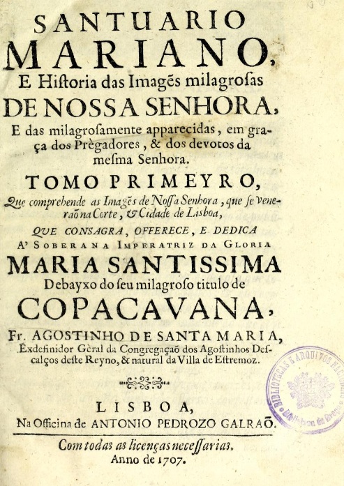 Frei Agostinho de SANTA MARIA. Santuario Mariano, e historia das imagens milagrosas de Nossa Senhora, e das milagrosamente apparecidas em graça dos pregadores e dos devotos da mesma Senhora. Tomo I. Lisboa: Officina de Antonio Pedrozo Galrão, 1707.