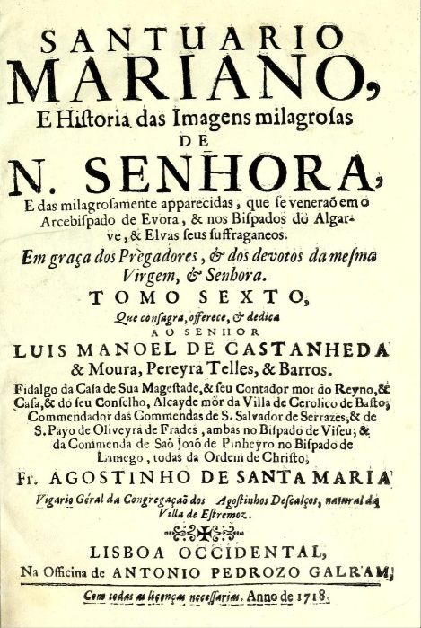 Frei Agostinho de SANTA MARIA. Santuario Mariano, e historia das imagens milagrosas de Nossa Senhora, e das milagrosamente apparecidas em graça dos pregadores e dos devotos da mesma Senhora. Tomo VI. Lisboa: Officina de Antonio Pedrozo Galrão, 1718.