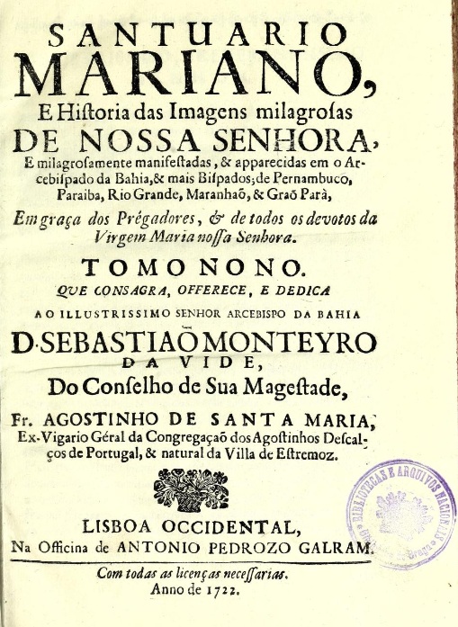Frei Agostinho de SANTA MARIA. Santuario Mariano, e historia das imagens milagrosas de Nossa Senhora, e das milagrosamente apparecidas em graça dos pregadores e dos devotos da mesma Senhora. Tomo IX. Lisboa: Officina de Antonio Pedrozo Galrão, 1722.