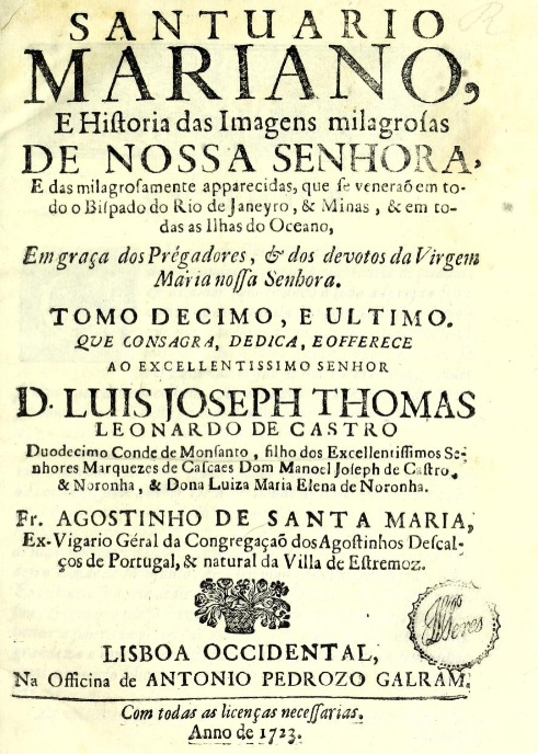 Frei Agostinho de SANTA MARIA. Santuario Mariano, e historia das imagens milagrosas de Nossa Senhora, e das milagrosamente apparecidas em graça dos pregadores e dos devotos da mesma Senhora. Tomo X. Lisboa: Officina de Antonio Pedrozo Galrão, 1723.